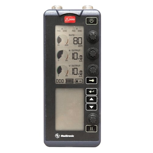 The Medtronic 5392 Dual Channel Temporary External Pacemaker is a battery-powered temporary pacemaker designed to assist a cardiac pacing lead system for either a single or dual chamber temporary pacing. The Medtronic 5392 temporary pacemaker can be used as a quick way to control the patient’s heart rate. The Temporary Pacemaker offers short-term synchronous and asynchronous pacing therapy. The system runs on two LR6 (AA-sized) alkaline batteries. The temporary pacemaker emits a current pulse that can maintain a consistent value set by the dials on the system. Medtronic offers a few different dual-chamber pacemakers including the Medtronic 5388.